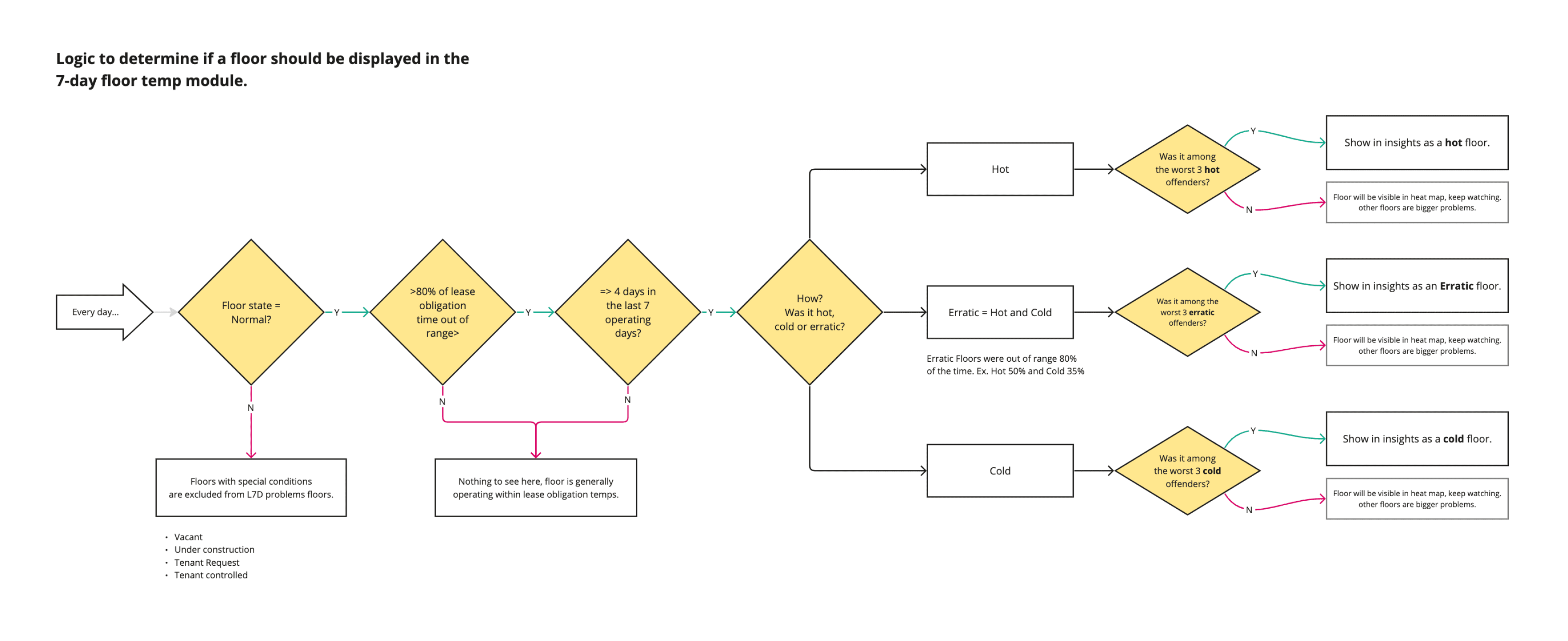 The design was intentionally scalable and context-sensitive. It only displayed alerts when floor temperatures were both out of range and relevant—factoring in user-supplied status tags like “unoccupied” or “under construction.” While these floors still appeared on the full heatmap for completeness, they were excluded from the insights dashboard to reduce noise and prioritize tenant comfort.